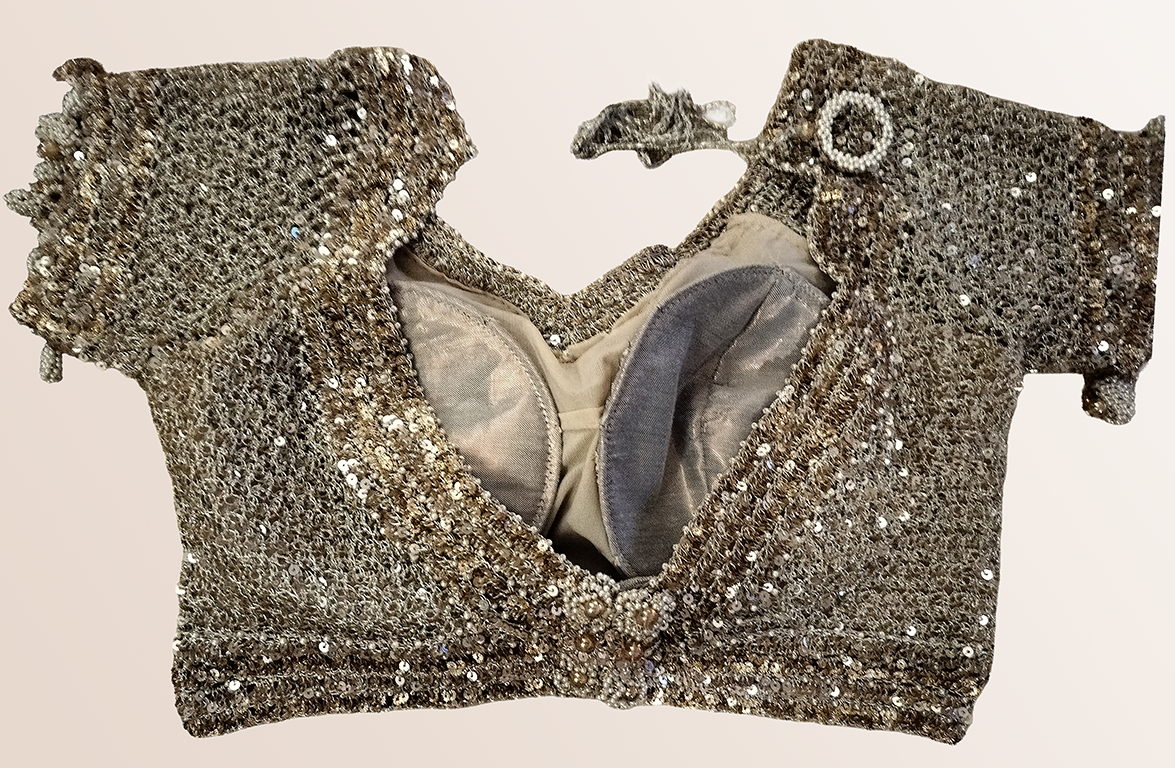 Each blouse requires a month to complete, reflecting the detailed artistry involved. Enhanced with delicate embellishments such as pearls, sequence, or bugle beads, these blouses offer elegance and intricate design.